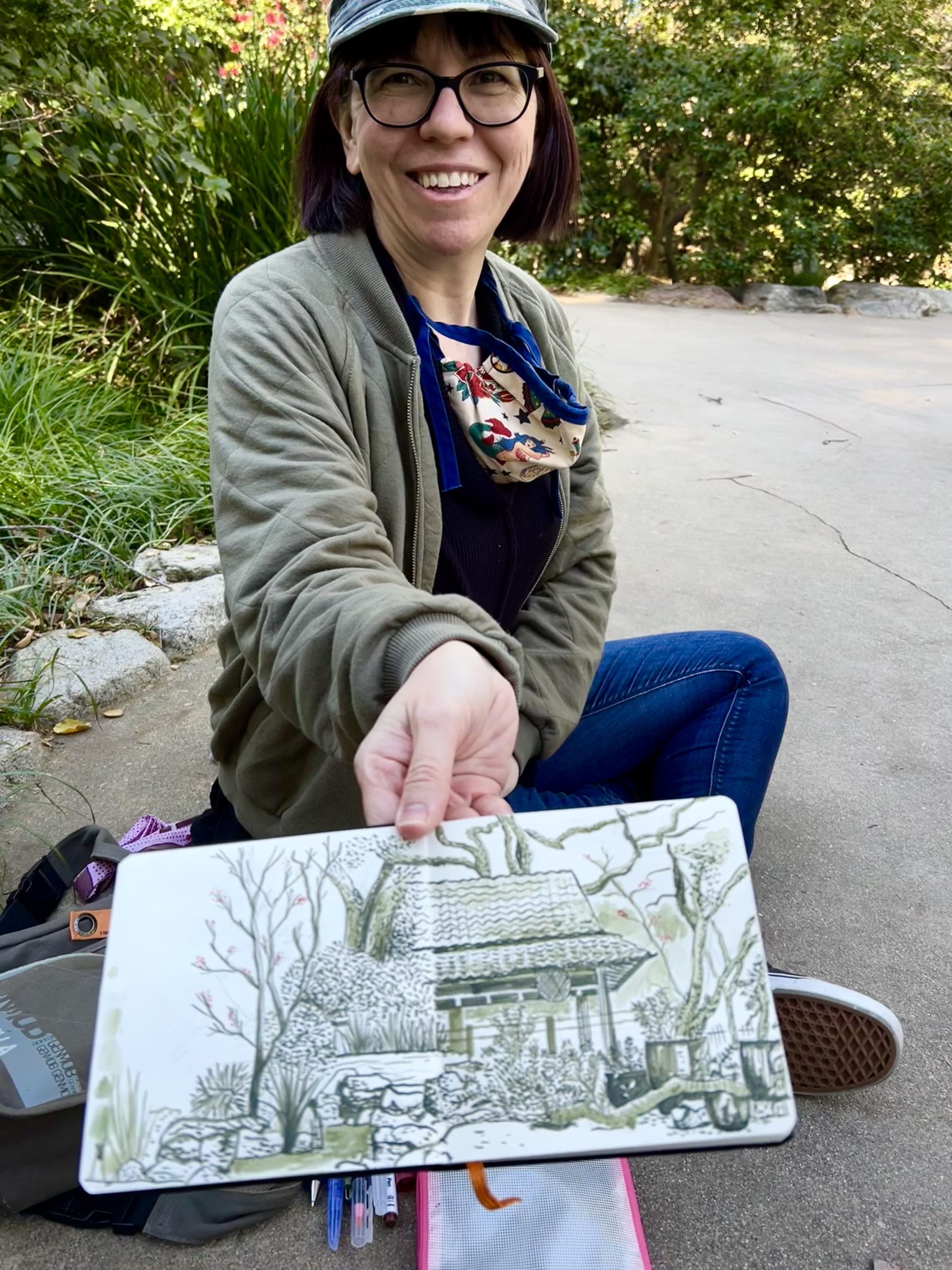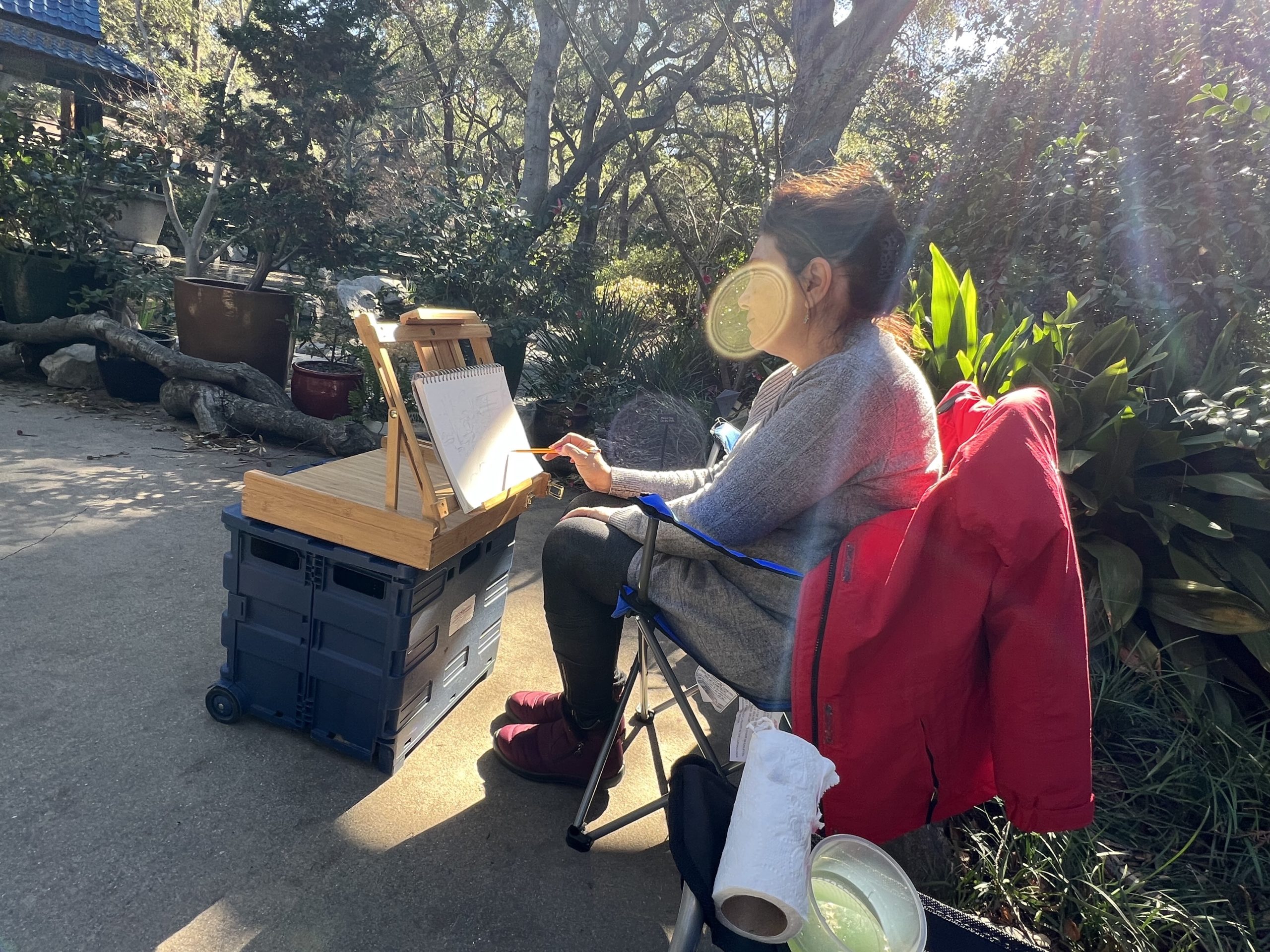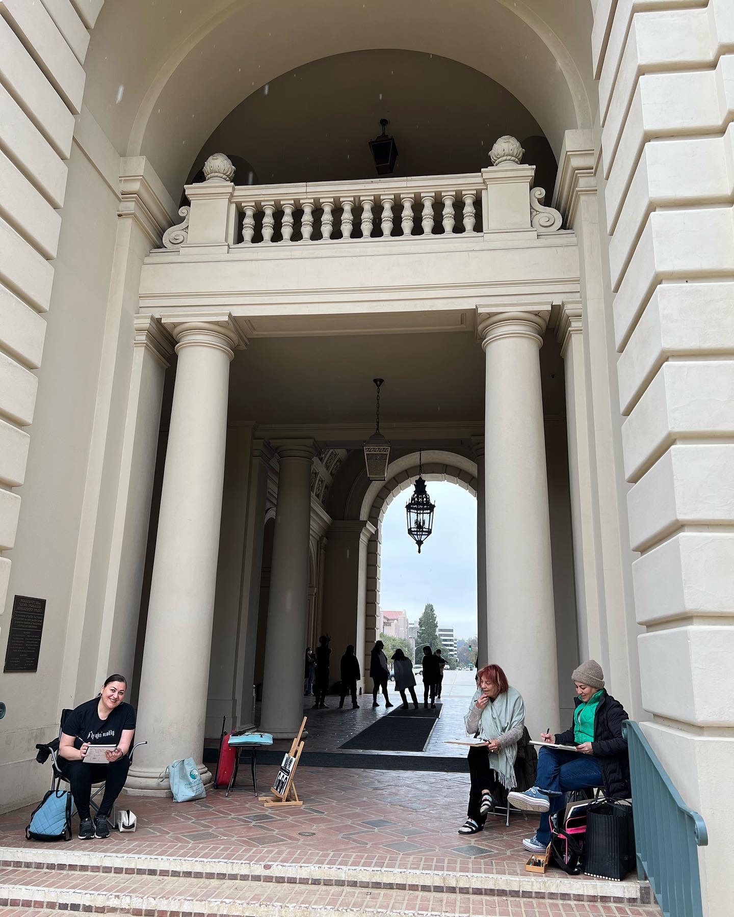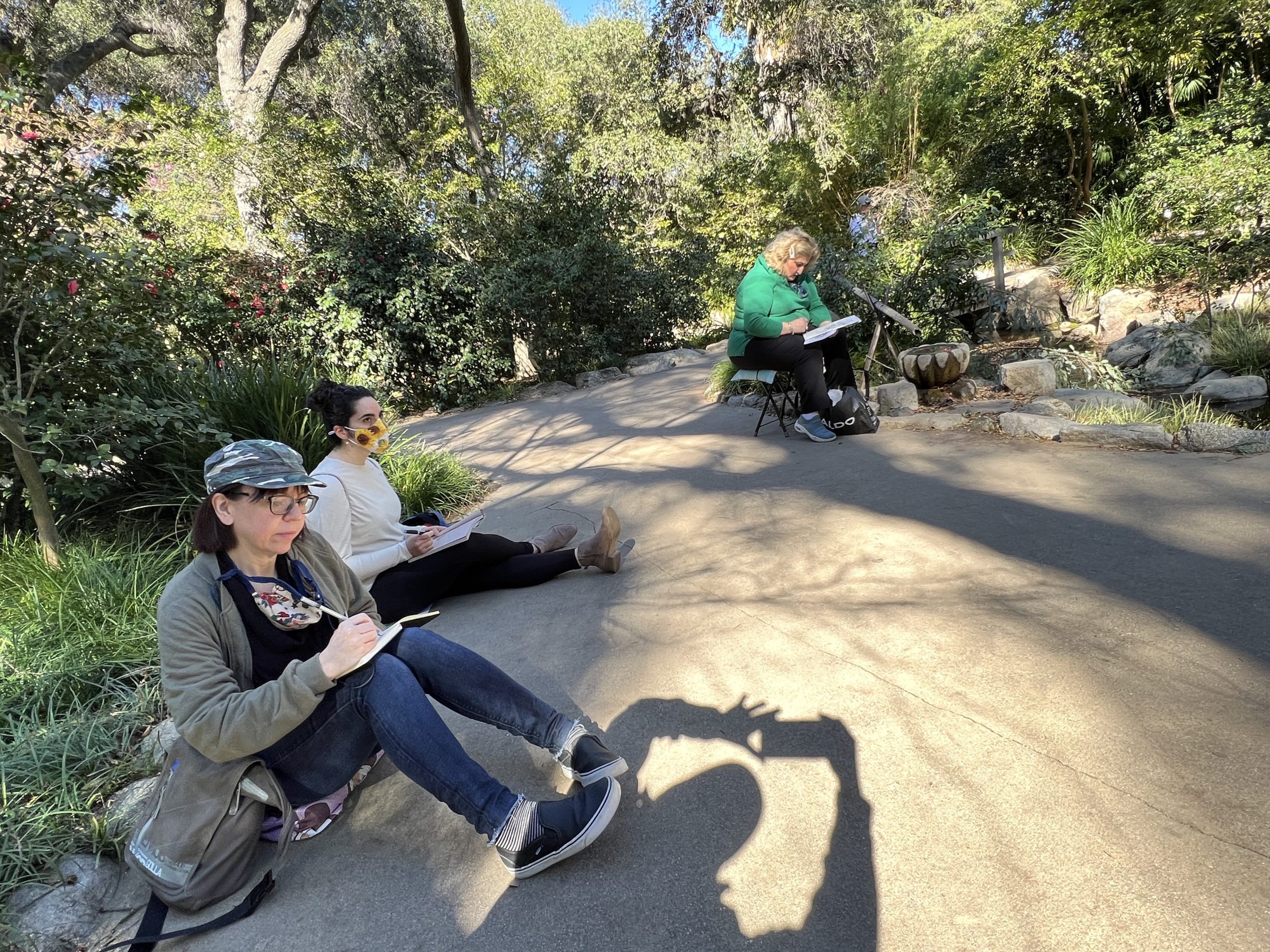Our locations so far have been Pasadena City Hall and Descanso Gardens. Even though it rained the first Saturday, we found cover inside the building and thoroughly enjoyed creating under romantic raindrops!